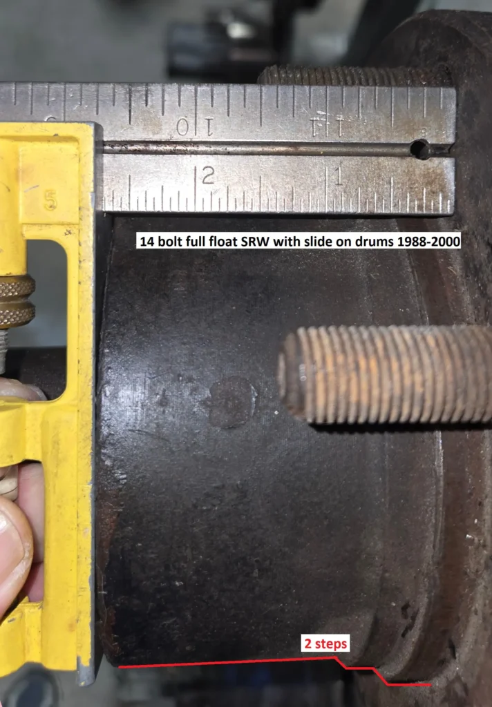 The newer SRW 14-bolt hub design measures approximately 2.625 inches (2 5/8 inches) from the wheel mounting surface, making it nearly an inch longer than its predecessor. The key identifying feature is two distinct steps at the wheel mounting surface instead of one. This newer style was manufactured from 1988 through 2000, overlapping with the older design for twelve years.
